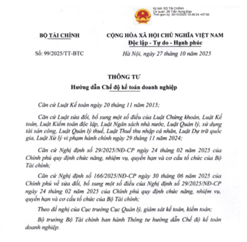 Ngày 27/10/2025 vừa qua, Bộ Tài Chính Việt Nam đã ban hành Thông tư 99/2025/TT-BTC- tạo ra một “cú hích” mạnh trong cộng đồng tài chính – kế toán và hệ thống quản trị doanh nghiệp tại Việt Nam. Không chỉ đơn thuần là một văn bản thay thế cho Thông tư 200 đã tồn tại hơn một thập kỷ, Thông tư 99 là sự thay đổi toàn diện nền tảng kế toán doanh nghiệp và mở đường cho việc hội nhập sâu hơn với các chuẩn mực quốc tế.
