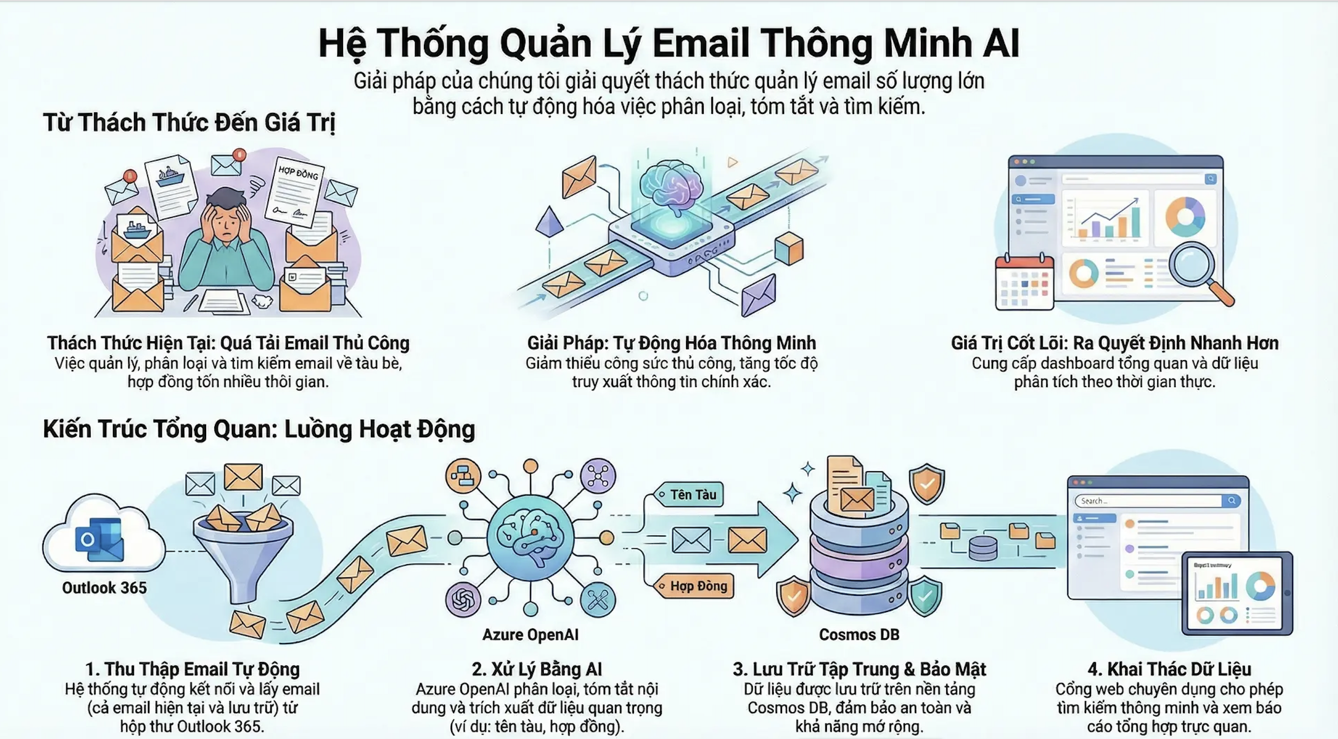 Recognizing these challenges, CMC Consulting introduces Smart Email—an AI-powered intelligent platform deeply integrated within the Microsoft 365 ecosystem. More than just a management tool, this solution represents a breakthrough that helps organizations standardize data and unlock workforce productivity through the power of generative AI.